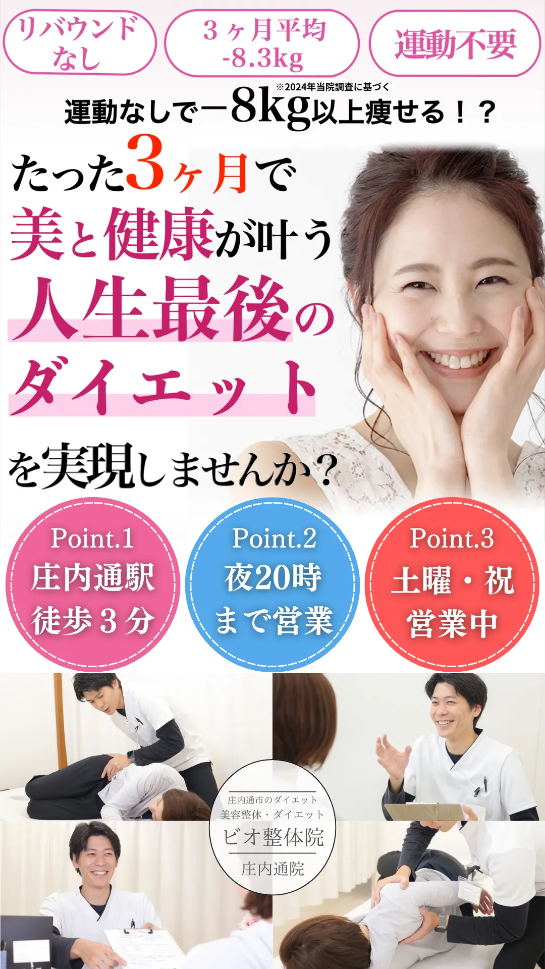 ダイエットのプロとしての証である資格を保有し、数多くのお客様から支持され、あなたの悩みに真正面から向き合う、ビオ整体院に来院し、健康と美容の先にある理想の自分を叶えて心から思いっきり楽しめる人生を手に入れる道。